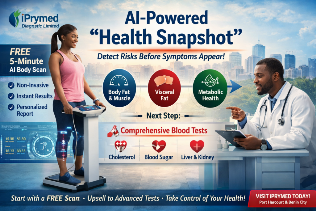 At iPrymed Diagnostic Limited, we are redefining preventive healthcare in Nigeria with our innovative AI-Powered “Health Snapshot” — a free, non-invasive body composition scan designed to attract, educate, and convert patients into long-term clients.